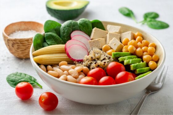 Bowl de feijão, grão-de-bico, tofu e quinoa
