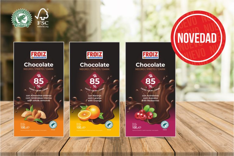 A família de produtos da marca Froiz cresce com a incorporação de novas referências na secção de chocolates. São três novidades que contêm 85% de cacau e se apresentam em diferentes variedades: recheados com laranja, arándanos e amêndoas inteiras. Estes produtos destinam-se principalmente a clientes adultos que procuram um chocolate preto de qualidade, sem sacrificar o sabor.