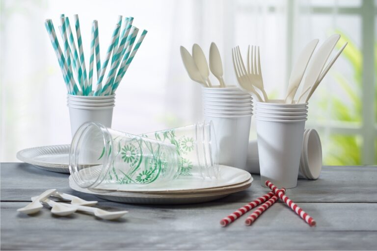 Os talheres – colheres, garfos e facas – são feitos de milho. As palhinhas coloridas são feitas de papel para uso alimentar e tinta não tóxica. Os copos de cartão são muito resistentes e retêm todos os líquidos sem se desfazer, seja com bebidas quentes ou frias. Por outro lado, os copos biodegradáveis são transparentes, e apesar de terem a aparência do plástico, na realidade são 100% biodegradáveis. Por último, os pratos descartáveis de cartão também biodegradáveis.