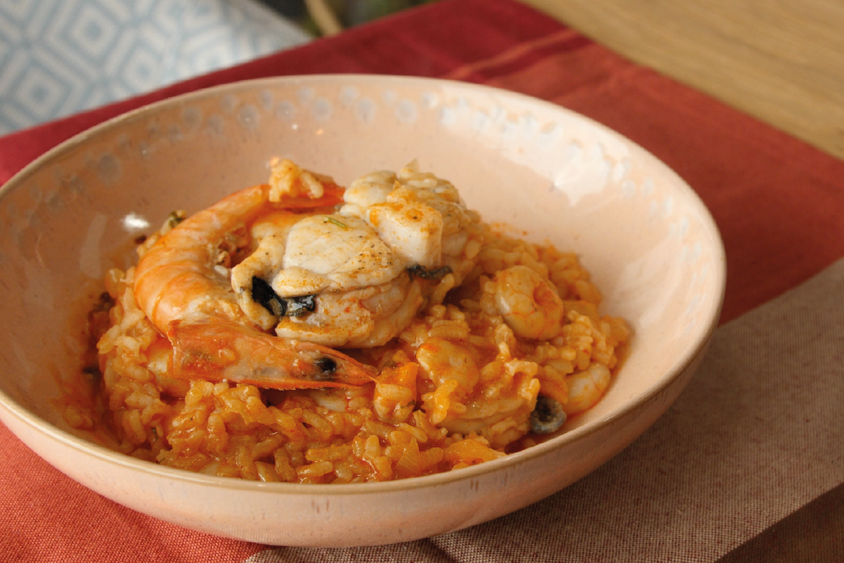 Depois deste tempo, adicionar o tamboril, o camarão e as gambas e deixar cozinhar mais 2 minutos.
