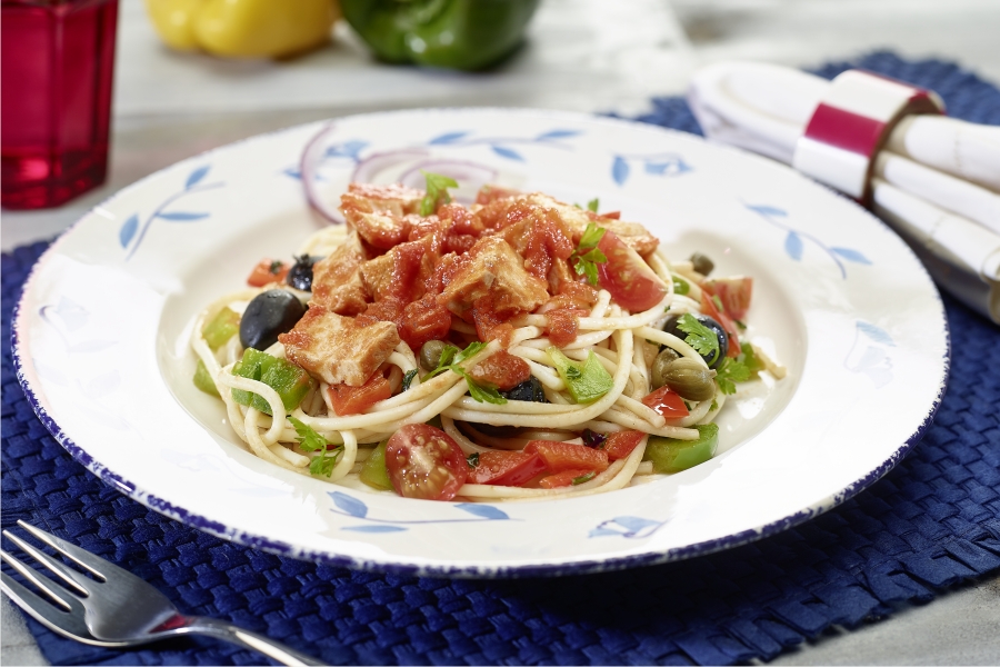 Atum fresco com molho de tomate e esparguete integral