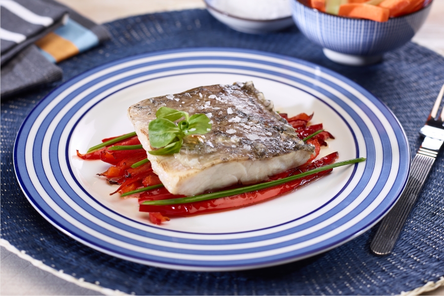 Por cima dos legumes coloque os lombos de corvina, com a pele virada para cima.