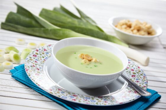 Descasque e corte a abóbora em pedaços pequenos. Pique a cebola e o alho francês e faça um refogado numa frigideira, juntando azeite a gosto.