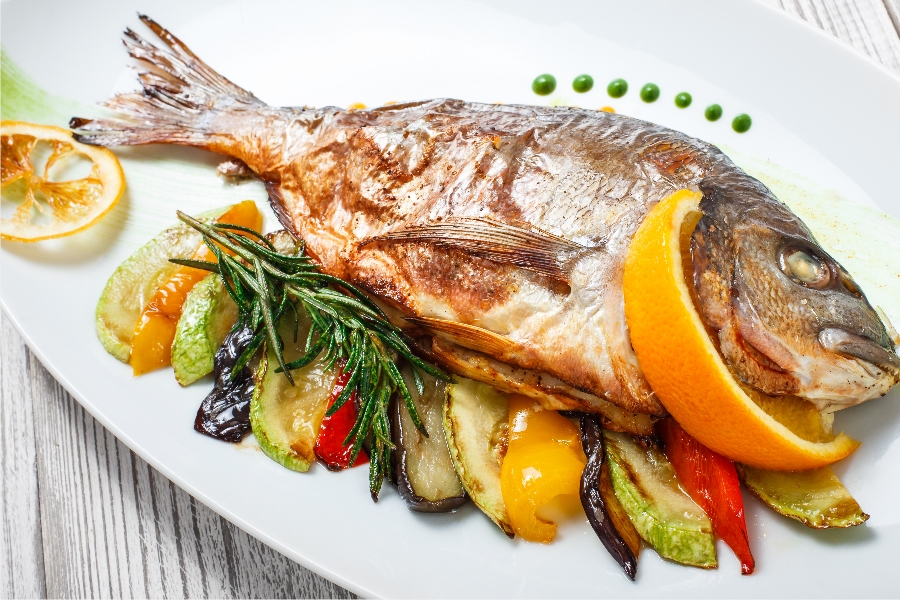 Coloque por cima a dourada, faça um corte e coloque uma rodela de laranja. Regue com o vinho branco, o azeite, o sumo do limão e tempere com sal.