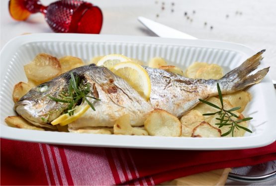 Corte a courgette e os cogumelos em fatias e disponha-os numa bandeja de ir ao forno, forrada a papel vegetal. Primeiro a courgette, depois os filetes de dourada e por cima os cogumelos. Tempere tudo com sal.