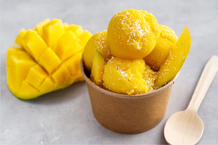 No copo de um liquidificador, coloque uma manga descascada e picada, umas gotas de sumo de limão, uma colher de mel, 50g de açúcar branco, uma pitada de sal e as natas liquidas. Misture tudo muito bem.
