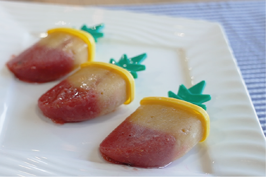 Verter as framboesas no fundo das formas de gelado. E acabe de encher com a mistura de manga e banana.