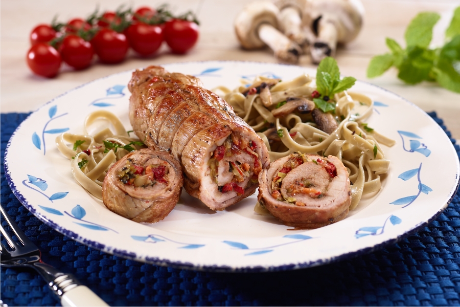 Por fim coloque o lombo na assadeira e leve ao forno durante 30 minutos. Quando estiver bem assado, retire o lombo do forno e corte às fatias, retirando o fio de cozinha.