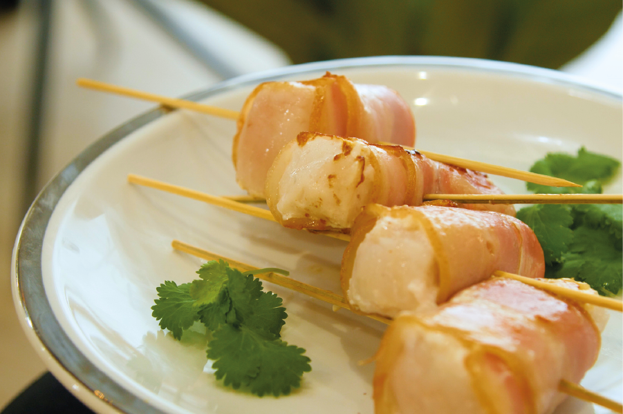 Enrolar cada medalhão de pescada numa fatia de bacon.