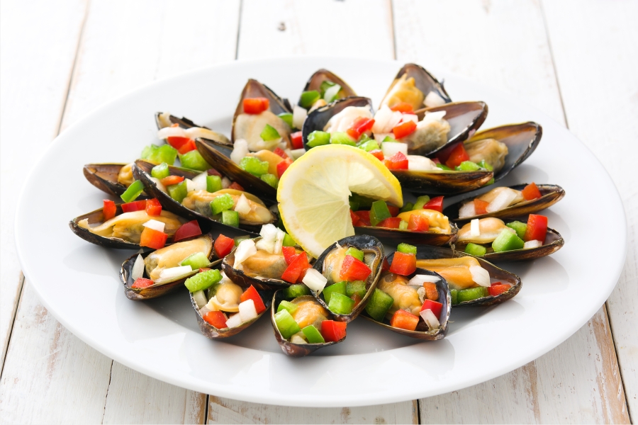 Coloque os mexilhões numa travessa e distribua esta mistura pelos mexilhões.