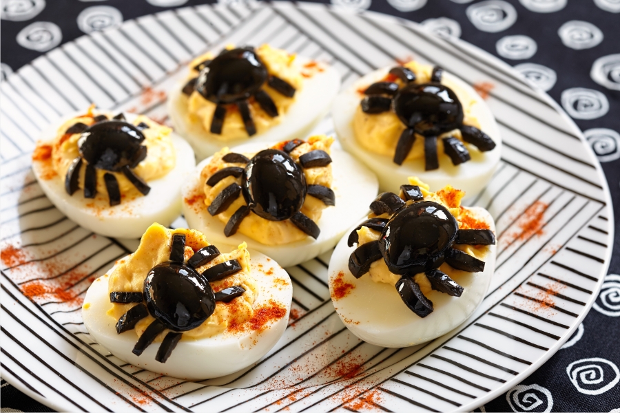 Recheie cada uma das metades dos ovos com esta massa e decore com azeitonas pretas cortadas às metades e rodelas, por forma a formar uma aranha como se vê na imagem.