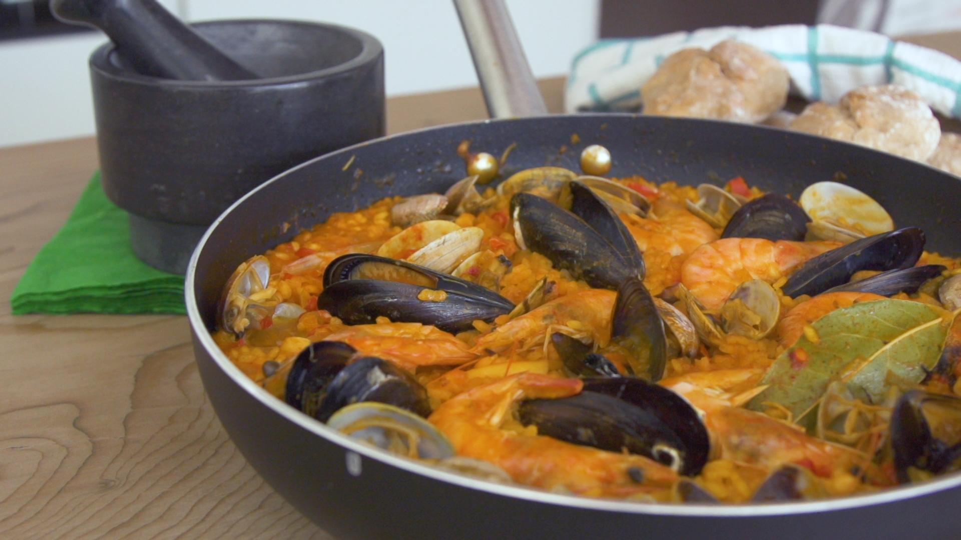 Numa panela própria para fazer paella, salteie estes legumes com um pouco de azeite e sal. Reserve.