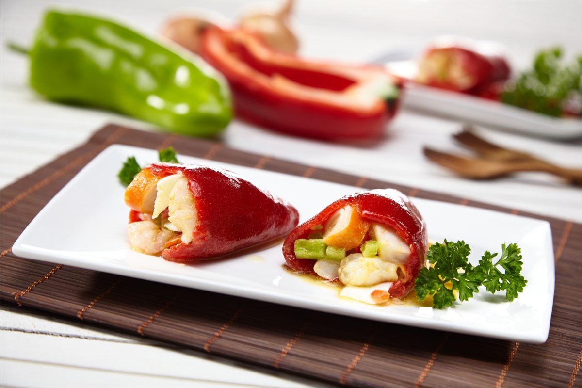 Tempere a mistura anterior com este vinagrete e recheie os pimentos.