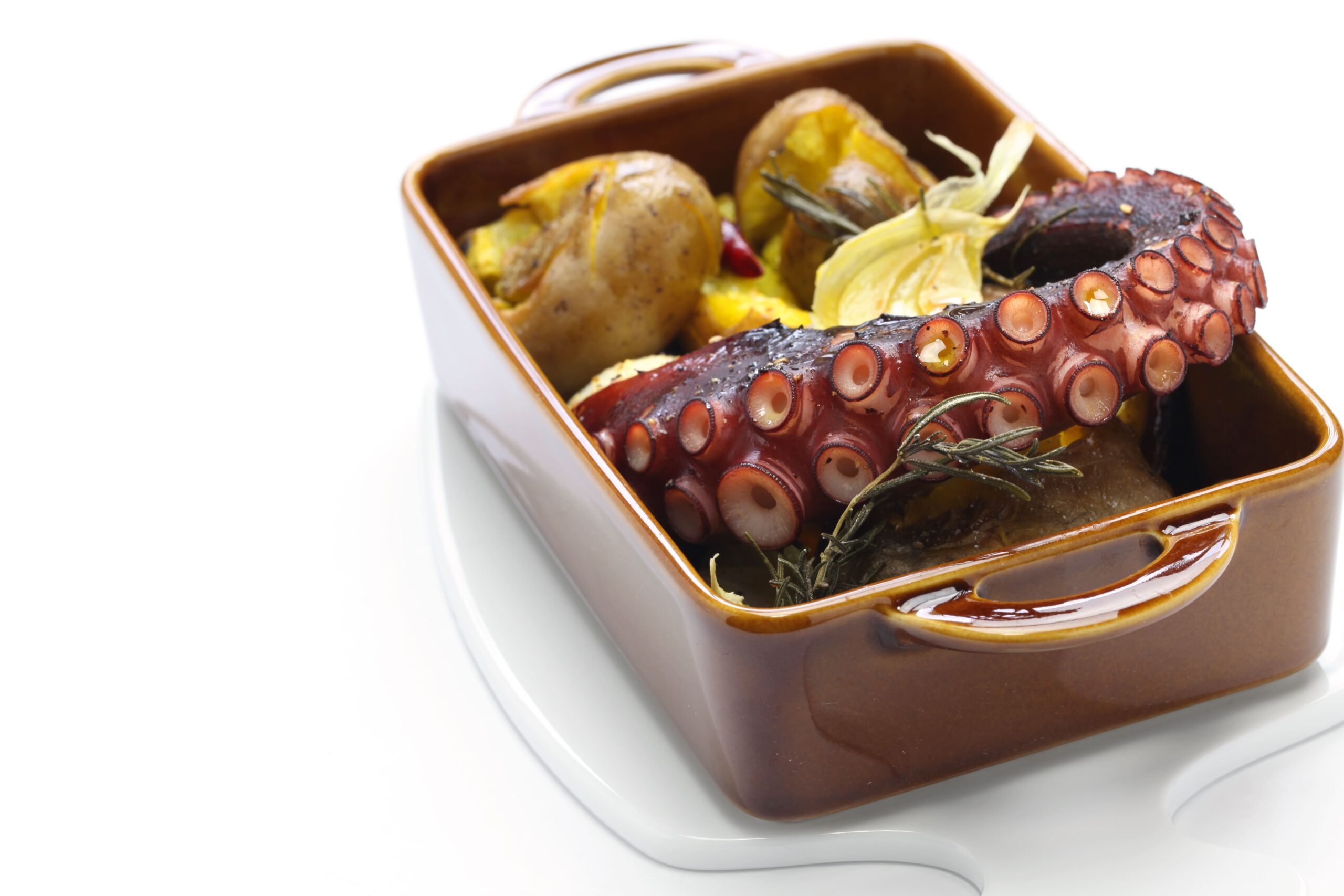 Num tabuleiro de ir ao forno, coloque o polvo juntamente com os dentes de alho esmagados, dispondo as batatas à volta. Junte a cebola cortada às meias luas e o ramo de alecrim. Tempere com sal e pimenta e regue com o azeite.