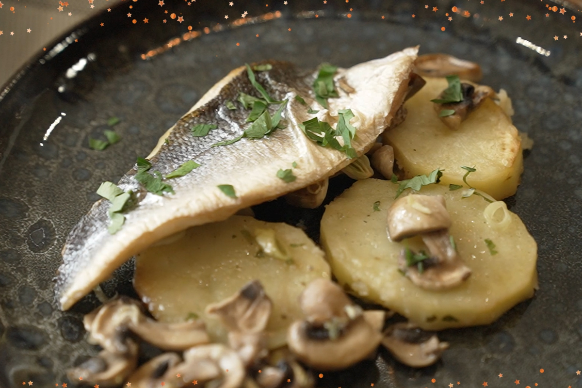 Com cuidado e com a ajuda de duas espátulas para servir peixe, retire os filetes e coloque-os no prato. Acompanhe com batatas, cogumelos e rebentos de alho. Decore com salsa e está pronto a servir.