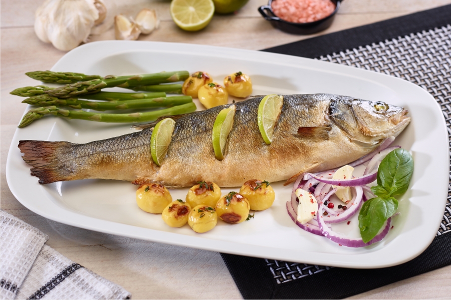 O robalo é um peixe de carne branca e delicada. Combina muito bem com o forno e com o limão.