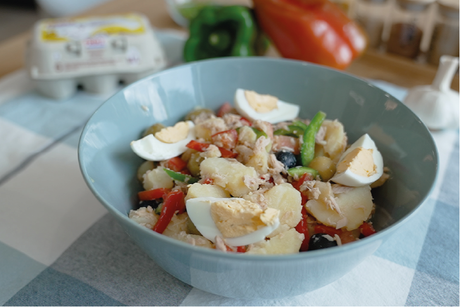 4. Juntamos todos os ingredientes numa taça e temperamos com sal, azeite e vinagre. Pronto a servir.