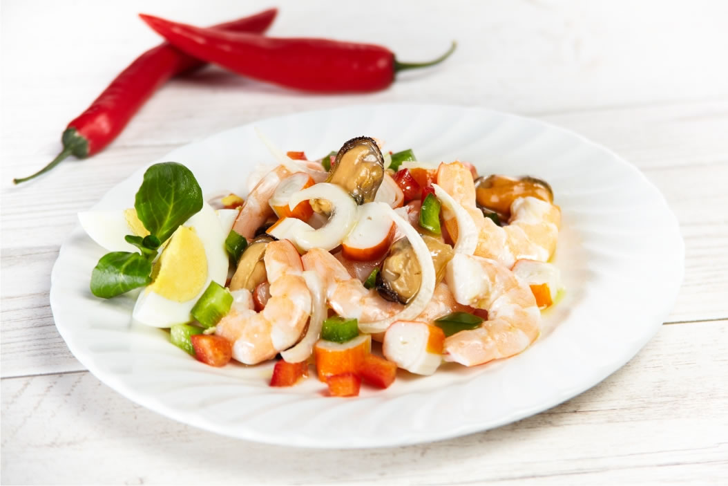 Tire a casca aos camarões e corte as delícias do mar em pedaços pequenos.