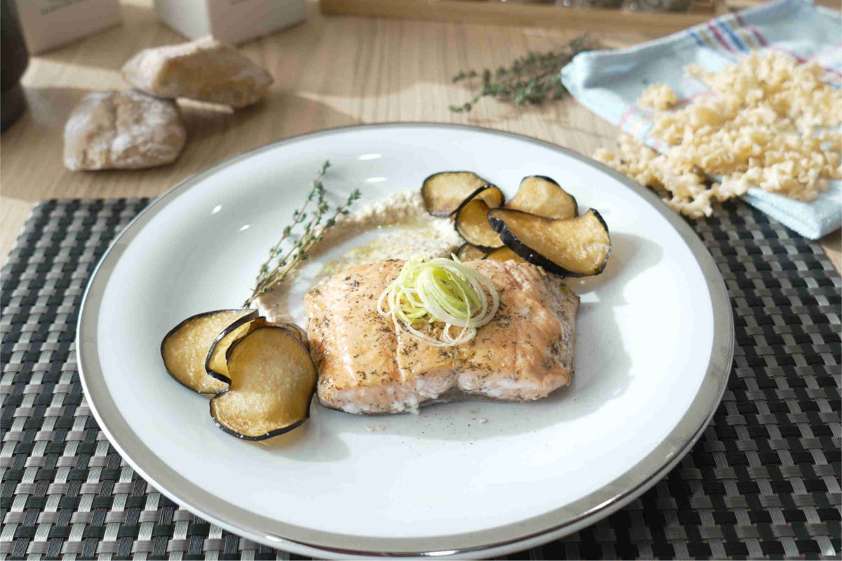 Sirva o salmão juntamente com o creme e os chips de beringela.