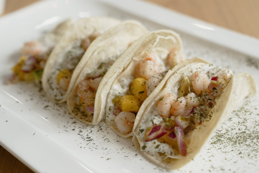 Aqueça os tacos, barre-os com o molho, depois adicione os camarões e posteriormente a mistura inicial.