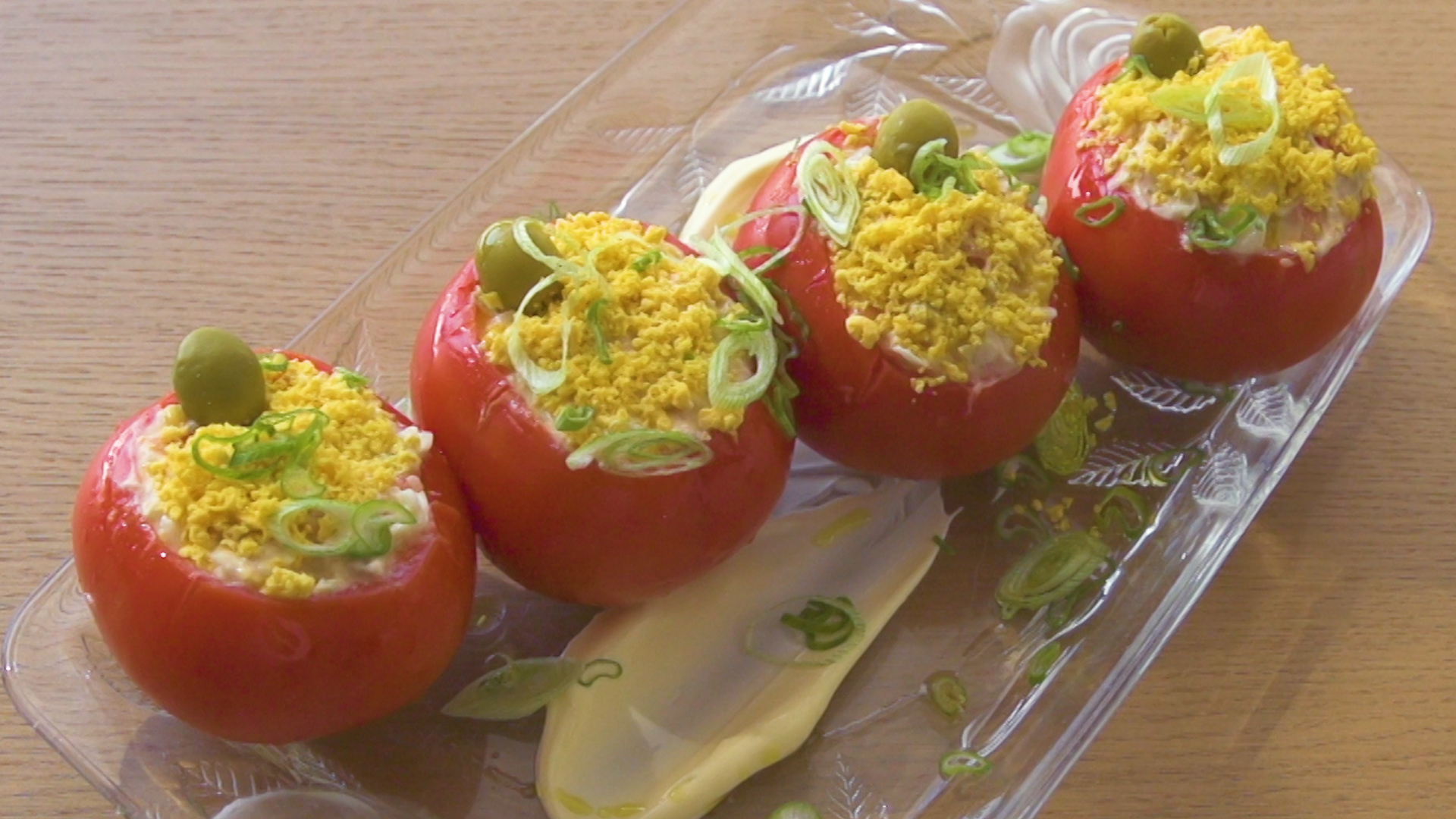 Recheie os tomates com este preparado, decorando-os com um pouco de gema de ovo picada e azeitonas verdes.