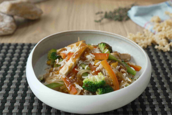 Wok de tofu com arroz e legumes